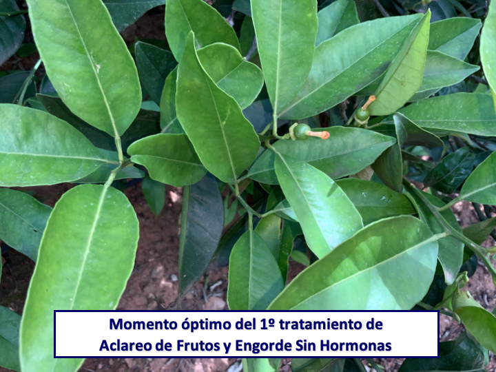 Citrus varieties prone to overproduction (such as Pri-23, Esbal, Tango, and Nadorcott) require fruit thinning to remove fruit from the tree that will not reach a good size and will also create competition for other fruit. Manual thinning is very costly and is carried out at the moment when the final fruit size is already determined at the cellular level.