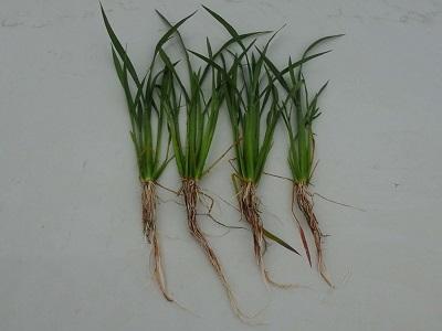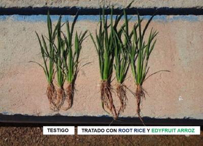 Semillas de la variedad de arroz Fonsa sembradas el 08/05/2015 con RISO RADICE en la zona de Valencia. Posteriormente, el 18/05/2015 se aplica RISO AI FRUTTI DI MARE, y en menos de un mes, se observa la diferencia en el sistema radicular frente a la planta no tratada.