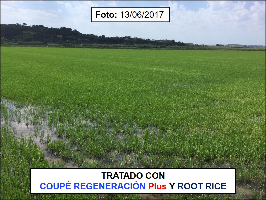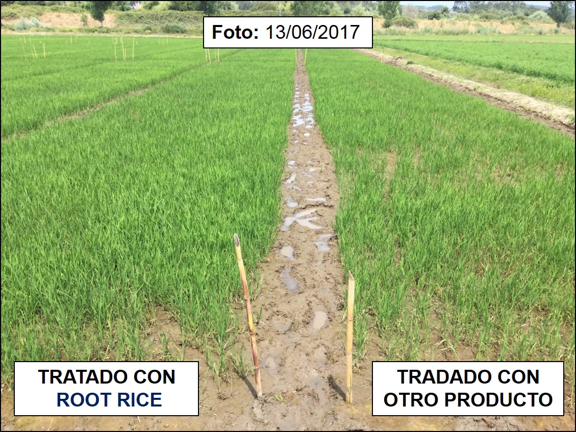La fotografia seguente è stata scattata presso il centro sperimentale di Montemor-o-Velho e in essa possiamo apprezzare la differenza nella coltivazione della zona trattata. RISO RADICE alla parte trattata con un altro prodotto presente sul mercato.