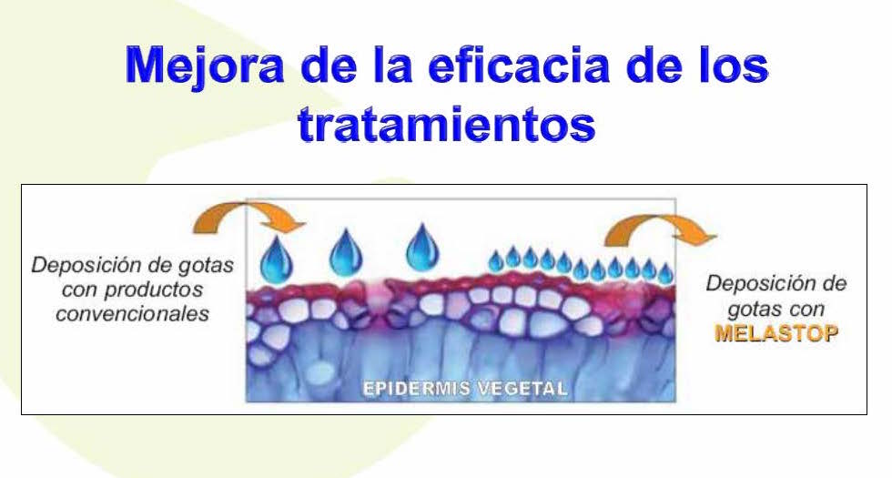 Hoy te hablamos de MELASTOP, una solución biotecnológica desarrollada por EDYPRO que actúa rebajando la tensión superficial del agua utilizada en la preparación de los caldos fitosanitarios para pulverización. MELASTOP consigue un buen reparto de la película de líquido aplicado en los tratamientos fitosanitarios y una mejor penetrabilidad de los principios activos empleados. Y, por tanto, con su aplicación se consigue un aumento de la eficacia en la hoja de los productos utilizados en los tratamientos.