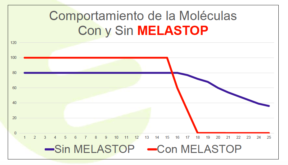 Junto a estas características, MELASTOP logra el Residuo Cero ya que una vez finalizada la vida útil de la molécula se potencia la posterior degradación de las materias activas en el cultivo creando una precipitada curva de degradación descendiente y reduciendo así los Límites Máximos de Residuos (LMR).