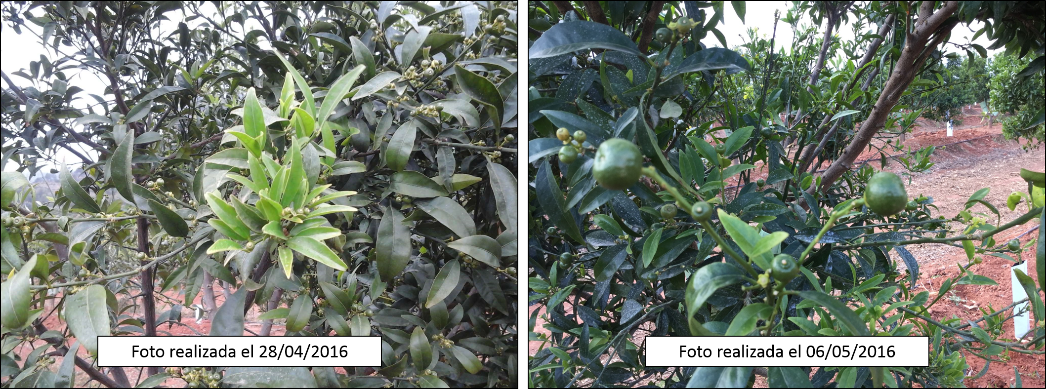 En las imágenes puede observarse que, entre ambas fechas, el arbolado ha mejorado de modo muy importante, tomando un excelente color y provocando una acentuada diferenciación floral y aumento de calibre. En este momento los frutos de primera flor están muy avanzados y pronto empezaremos los tratamientos de Aclareo de Frutos Sin Hormonas para eliminar los frutos de segundo y tercera flor que despreciamos para reducir los costes de aclareo de frutos manual.