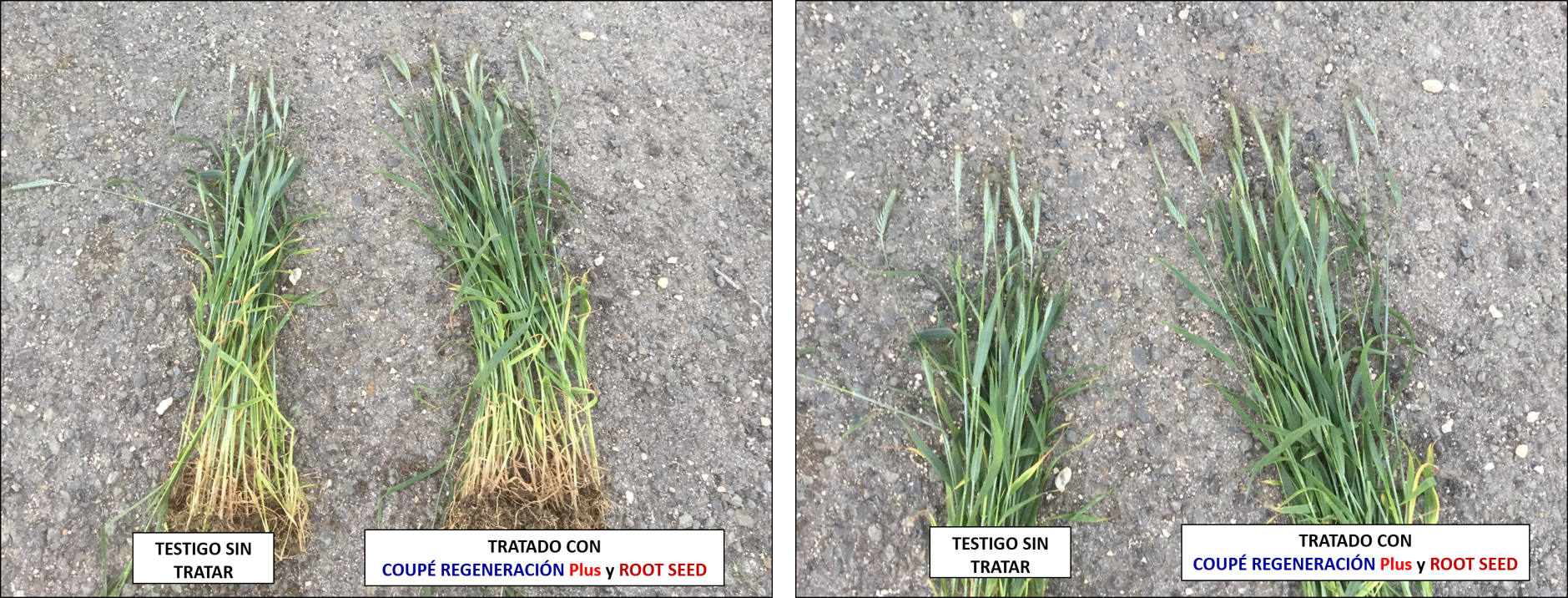 Los resultados en cuanto a longitud de la espiga y número de granos por espiga son mayores en la parcela tratada con COUPÉ REGENERACIÓN Plus que en la tratada con ROOT SEED y COUPÉ REGENERACIÓN Plus debido al exceso de plantas que ha generado ROOT SEED.