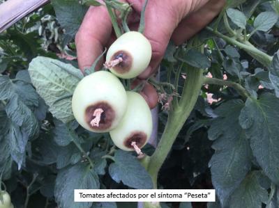 A continuación se muestran unas imágenes de unos tomates, pimientos y cítricos, afectados por el síntoma “Peseta”, causada por una deficiencia localizada de calcio en los tejidos del fruto, que puede derivar en una pudrición interna.