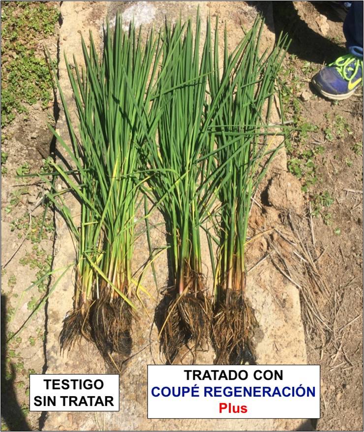 Como podemos comprobar COUPÉ REGENERACIÓNPlusincrementa el intercambio catiónico y permite un mejor aprovechamiento de los fertilizantes empleados generando una mejora evolutiva en el cultivo. La planta acaba alongando su vida útil y se le permite llenado máximo de espiga.