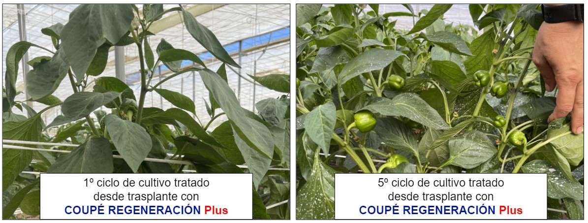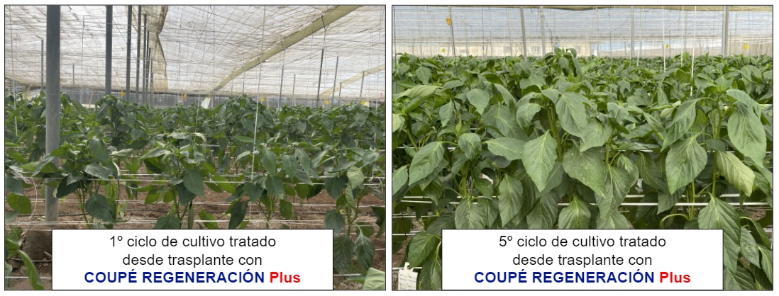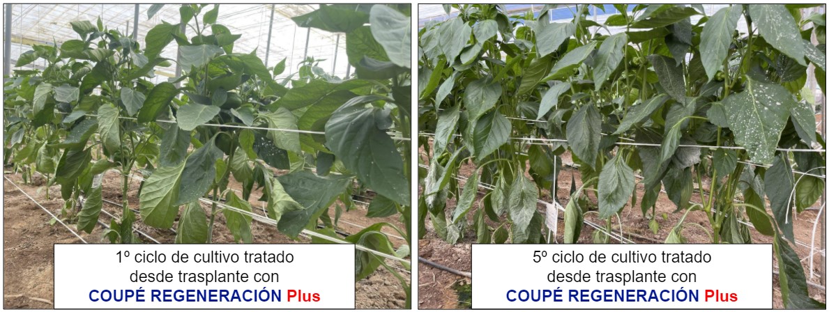 Este poderoso efecto de nuestra biotecnología se muestra en los casos que ofrecemos a continuación. Se trata de dos invernaderos de pimiento que se han tratado con COUPÉ REGENERACIÓN Plus a partir del día del trasplante, pero la diferencia entre estos invernaderos consiste en que el 1º invernadero es el 1º año que se aplica COUPÉ REGENERACIÓN Plus y en el 2º invernadero se ha ido aplicando en los cultivos desde el 2017 de forma continuada.