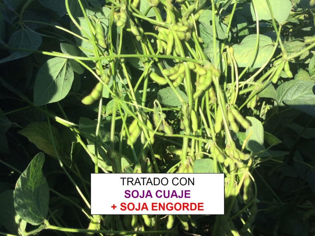 - SOJA ENGORDE, activando la acumulación de las reservas en las vainas que permite lograr el máximo peso específico de los granos, uniformando el proceso de engrosamiento y de maduración de las vainas.