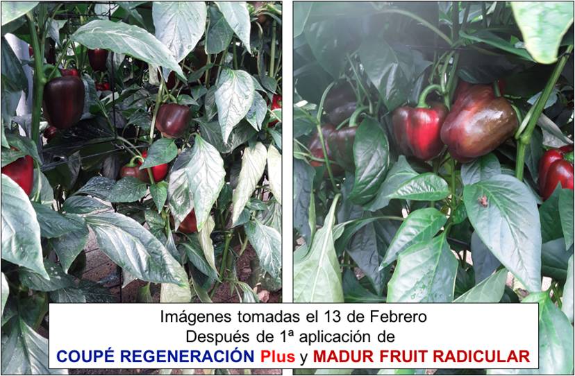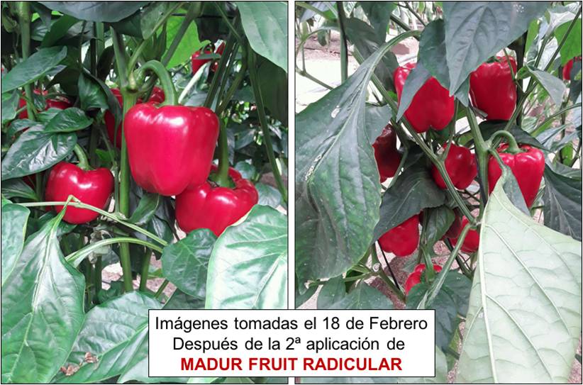 - Potenciar el cambio de color en el 100% de la periferia del fruto. Y lograr el tono óptimo de la genética de la variedad con MADUR FRUIT RADICULAR aplicado a 15 L./ha. el 8 de Febrero y repetido a la semana.