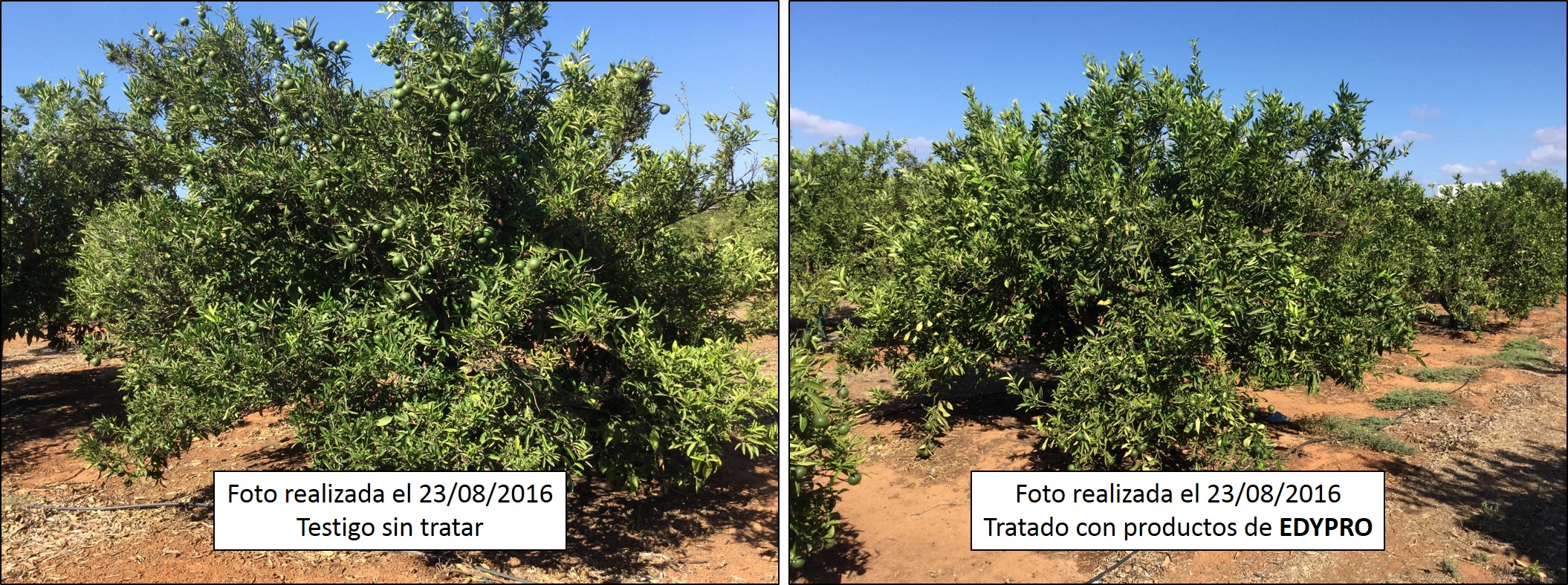 Estos tratamientos biotecnológicos se han llevado a cabo de modo muy riguroso y aquí podemos ver el resultado: Los árboles en la parte tratada tienen brotes nuevos y los frutos están engordando de modo correcto.