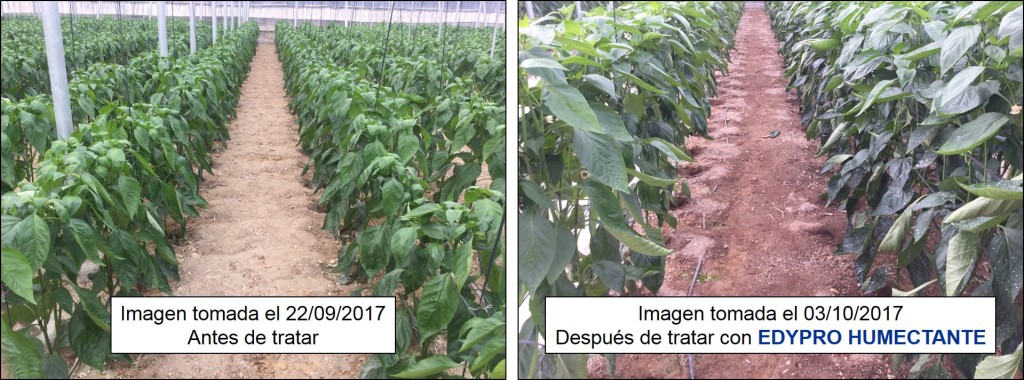 Puede observarse en las imágenes cómo con la aplicación de EDYPRO HUMECTANTE en cultivo establecido se consigue corregir el comportamiento del agua en el suelo y ensanchar el bulbo de goteo.