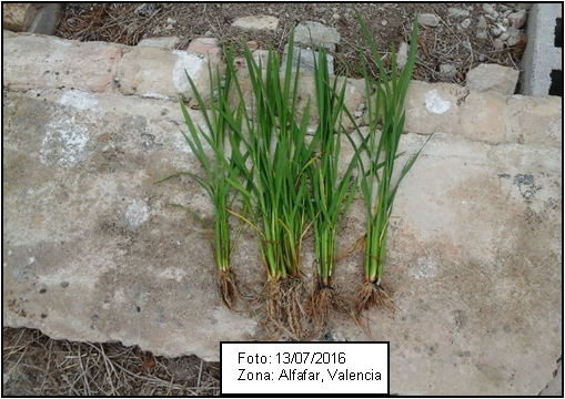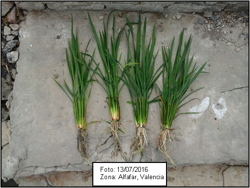 1. Arroz Piñana tratado con RICE VIGOR + Propanil + Bentazona + MELASTOP en el 2º pase de herbicida. En la foto pueden ver como la raíz se está recuperando y aparecen raíces blancas.