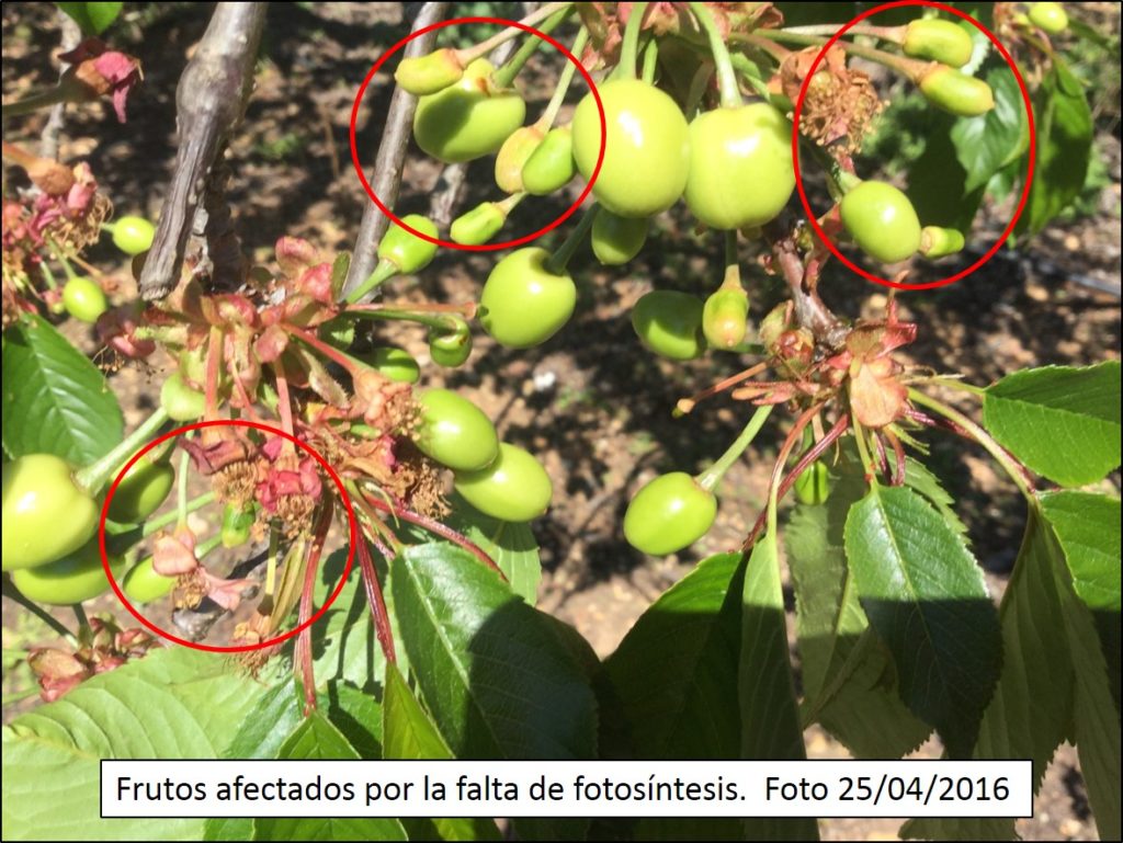 Como puede observar, hay frutos afectados por baja capacidad de fotosíntesis, que se han detenido en su desarrollo y están a punto de perderse (aborto).